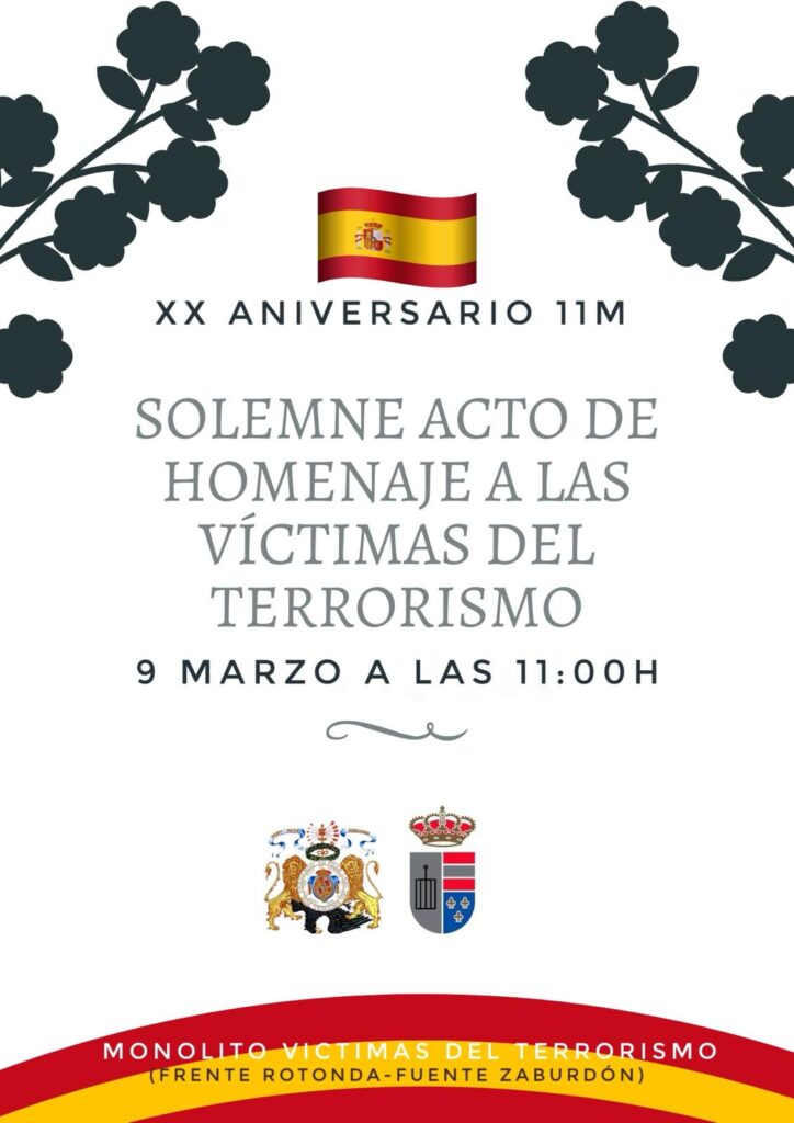 Acto de Homenaje por las victimas de terrorismo en El Escorial. Este sábado 9 de marzo a las 11:00 en el Monolito -Rotonda Victimas del Terrorismo ( Carretera de Guadarrama). Coincidiendo con el veinte aniversario del atentado de Atocha. Los municipios de El Escorial y San Lorenzo de El Escorial rinden homenaje a todas las […]