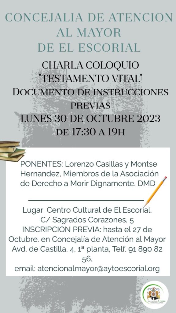 La charla, a cargo de Lorenzo Castillas y Montse Hernández como ponentes y miembros de la asociación de Derecho a Morir Dignamente, se realizará el 30 de octubre de 17:30 a 19:00 en el Centro Cultural de El Escorial.